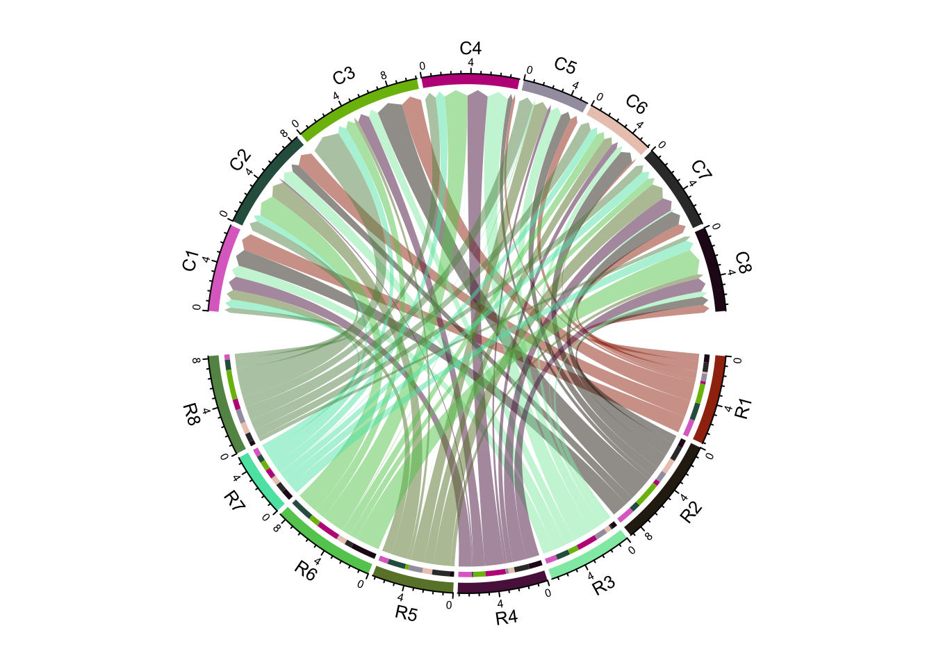 Under default settings, the grid colors which represent sectors are randomly generated, and the link colors are same as grid colors which correspond to rows (or the first column if the input is an adjacency list) but with 50% transparency.