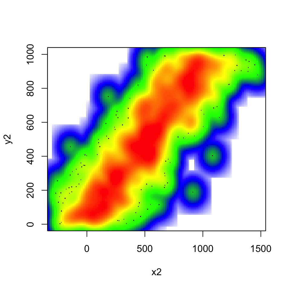 If you use the smoothScatter() function, you get the densities.