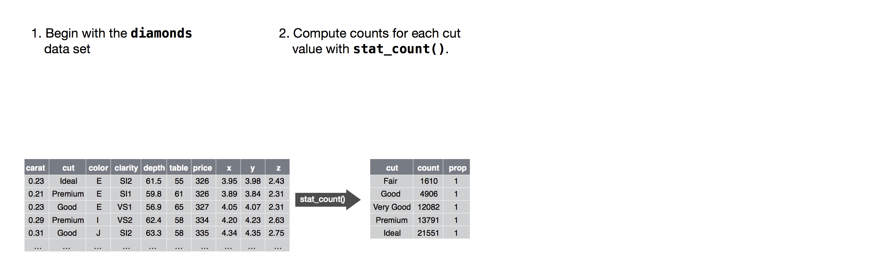 The algorithm used to calculate new values for a graph is called a stat, short for statistical transformation. The figure below describes how this process works with geom_bar().