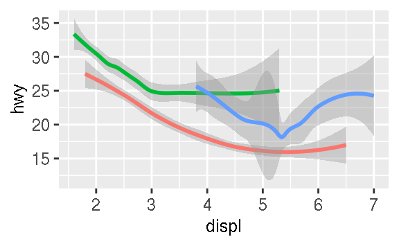 ggplot(data = mpg, mapping = aes(x = displ, y = hwy, color = drv)) + geom_point() + geom_smooth(se = FALSE)What does