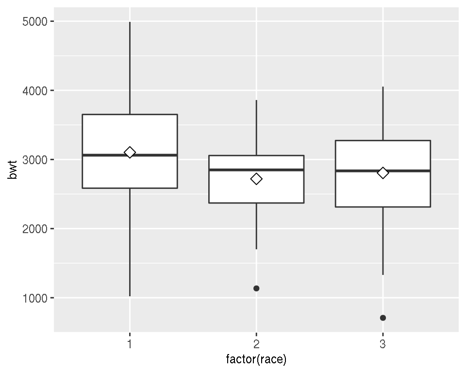 Use stat_summary(). The mean is often shown with a diamond, so we’ll use shape 23 with a white fill. We’ll also make the diamond slightly larger by setting size = 3 (Figure 6.21):