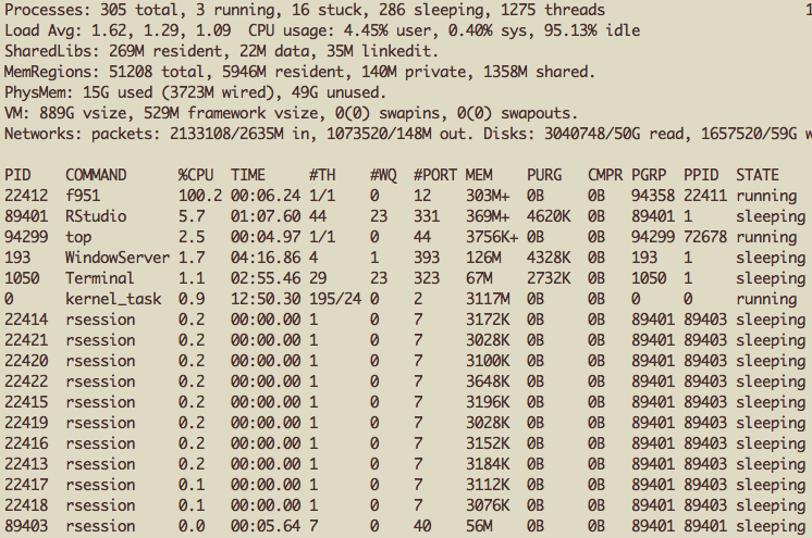+ }, mc.cores = 10) ## Split this job across 10 coresWhile this “job” was running, I took a screen shot of the system activity monitor (“top”). Here’s what it looks like on Mac OS X.